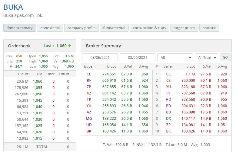 Saham pt bukalapak.com tbk (buka) sukses melejit hingga menyentuh batas atas auto rejection sepuluh menit setelah perdagangan dibuka, harga saham buka sudah mentok di posisi rp 1.060.